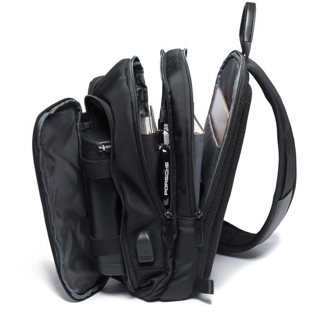 در قسمت بیرونی کیف، پورت شارژ USB تعبیه شده تا بتوانید هنگام سفر یا در مسیرهای روزمره، به کمک پاوربانک گوشی خود را به راحتی شارژ کنید؛ بدون نیاز به پریز برق.